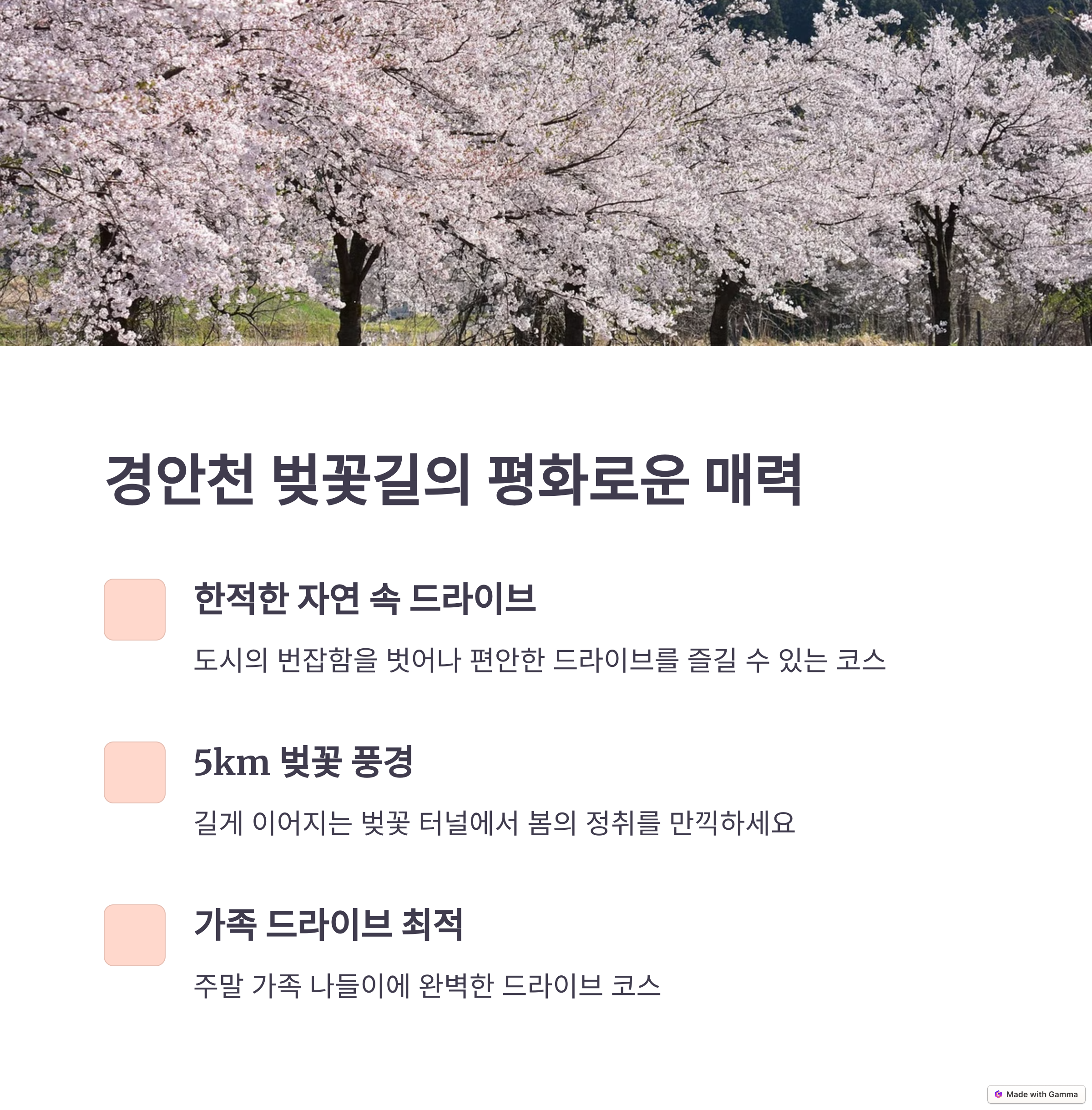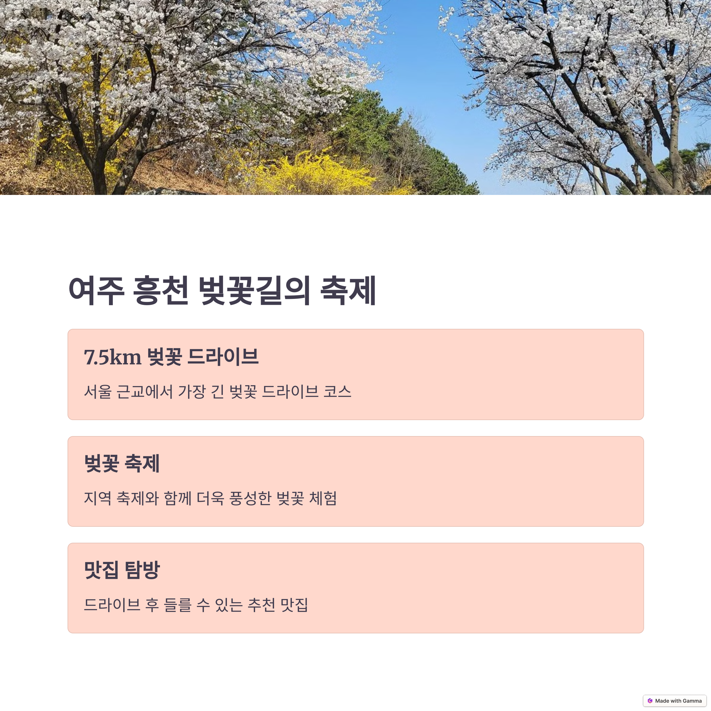 드라이브하며 벚꽃을 감상하는 특별한 순간은 봄마다 다시찾고 싶은 추억이 될 것입니다.